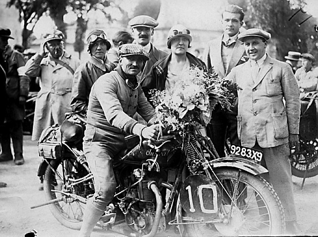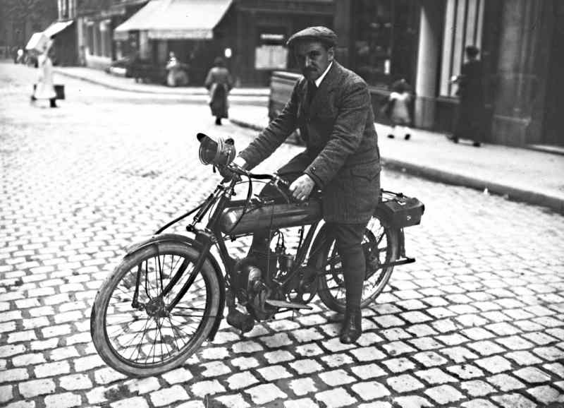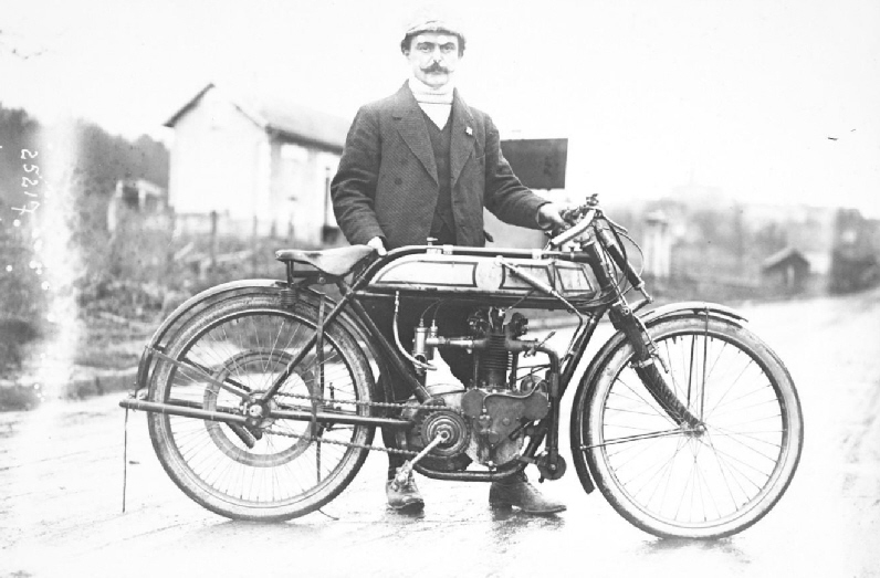 Ci-dessus, Jean BERNADOU-DACIER sur une Austral lors de la course Paris-Tours le 13 septembre 1913. Il terminera 1er dans la catégorie 250cc. Cette motocyclette était équipée d’un moteur Zurcher 4 temps à soupapes latérales d’une cylindrée de 250cc.