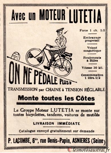 LUTETIA était un motoriste assez connu à l’époque pour ses moteurs destinés aux aéronefs mais également pour ses moteurs de Hors-bord réputés dans le monde entier. La société dirigée par Marcel ECHARD était située au 31, Boulevard de Courbevoie à Neuilly sur Seine. Il n’hésitera pas à protéger la plupart de ses réalisations par des brevets enregistrés dans plusieurs pays notamment anglo-saxons. Je n’ai pas réussi à mettre la main sur le brevet concernant le moteur 250cc équipant les premières PC mais cela viendra. Vous pouvez consulter pour votre curiosité le brevet concernant la motorisation d’une bicyclette (Pub ci-dessous), d’un volant magnéto ou d’un moteur de Hors-Bord ici.