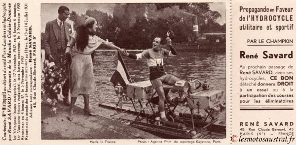 Le 17 novembre 1927, René Savard quitta Calais (Bienvenue chez moi !) et franchit la jetée à 10H35, point de départ. Il sera convoyé par le bateau de pêche « Le Poilu n° 104 » à bord duquel avait pris place un opérateur de cinéma, un correspond du New-York Times et quelques journalistes. A environ un mille nautique du départ, il lança à l’eau deux belles couronnes portant l’inscription « A Nungesser et Coli, aux grands disparus de l’Atlantique». Avec une moyenne horaire de 10 kilomètres, il est rapidement en vue de Douvres. Mais la mer devenait plus houleuse et comme la marée était contraire, il fallut près d’une heure pour que la Nautilette puisse amerrir au port de Douvres. A l'arrivée, il était dans un tel état d'épuisement qu'il s'est évanoui en descendant de son hydrocycle. Il réalisera ainsi la 1ème traversée de la Manche (Channel) en hydrocycle en 6 Heures 6 minutes, ce qui, somme toute, représentait une belle moyenne sur l’eau.