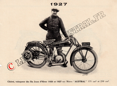 Et que serait Austral sans Etienne Chéret, un mythe, ce grand pilote débauché de la concurrence par Dacier aura un rôle important sur la renommée de la marque. Cette dernière aura à cœur de l’associer ainsi que Schweitzer dans ses catalogues motocyclettes de 1927 et 1928.
