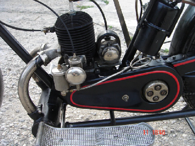 LA TRANSMISSION : La transmission de mouvement du moteur à la roue arrière se fait au moyen de deux chaines, l’une allant du moteur à l’arbre principal de la boite de vitesses, l’autre de l’arbre intermédiaire à la roue arrière.