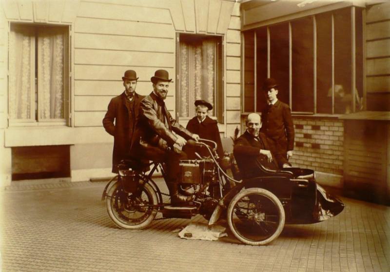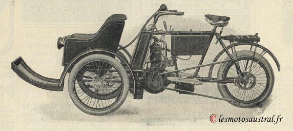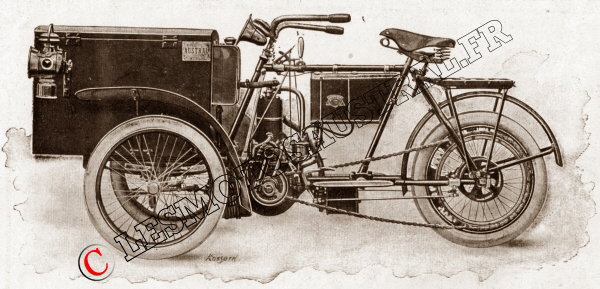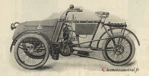 LE MOTEUR : ASTER Puissance de 4 HP environ, moteur à essence de pétrole actionné à l’essence de 680° à 700° ayant un seul cylindre vertical de 80 mm d’alésage et 90 mm de course. Carburateur à pulvérisation et niveau constant. Vitesse maximum de rotation de 1800 tours par minute, le mototricycle en palier et en grande vitesse. Ce nombre de tours peut être diminué en agissant sur l’admission de l’air servant à la carburation et le retard à l’allumage. Ces dispositifs sont actionnés par des manettes. Allumage électrique par étincelle de rupture d’un courant produit par une batterie de piles sèches ou accumulateurs et une bobine d’induction. Refroidissement par circulation d’eau par thermo-siphon. Pot d’échappement annulaire de 13 cm de diamètre extérieur. Réservoir d’essence avec robinet d’arrêt à l’origine de la tuyauterie. Réservoir d’eau contenant 10 litres environ, placé à l’avant du tube de direction, en charge sur le radiateur.