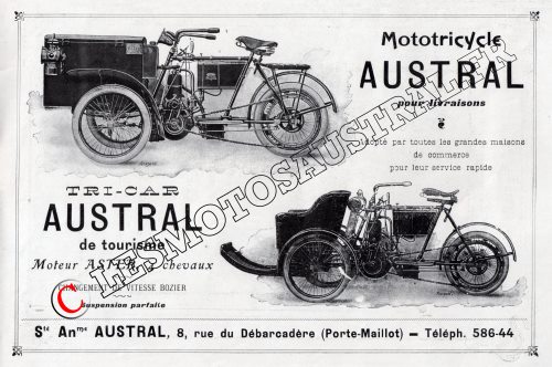 Le Mototricycle AUSTRAL a trois roues, deux directrices à l’avant et une motrice à l’arrière. Elles sont reliées entre elles par un châssis rigide, au milieu duquel est fixé le moteur.